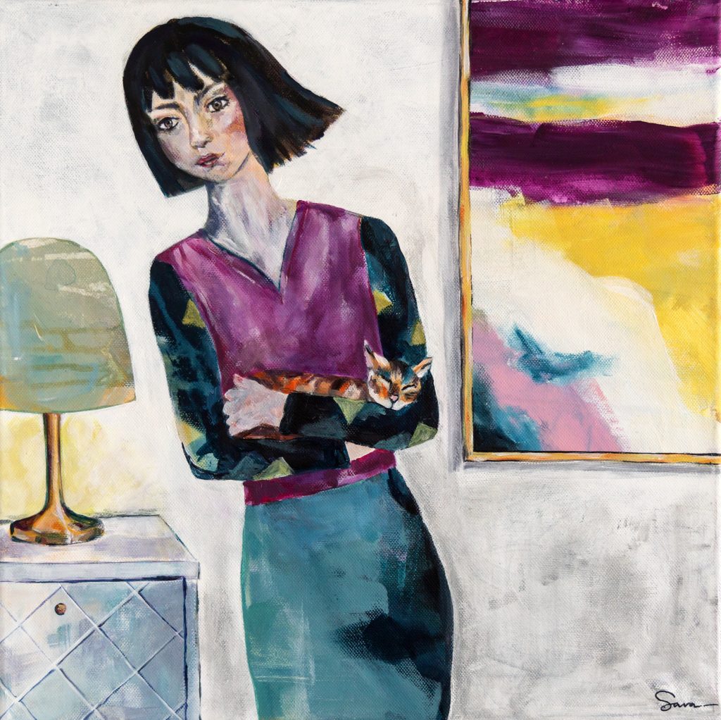 Målningen är en av flera i en serie där jag har fokuserat på olika rum och interiörer. Utifrån en abstrakt bakgrund har jag fångat ett ögonblick från min fantasi.