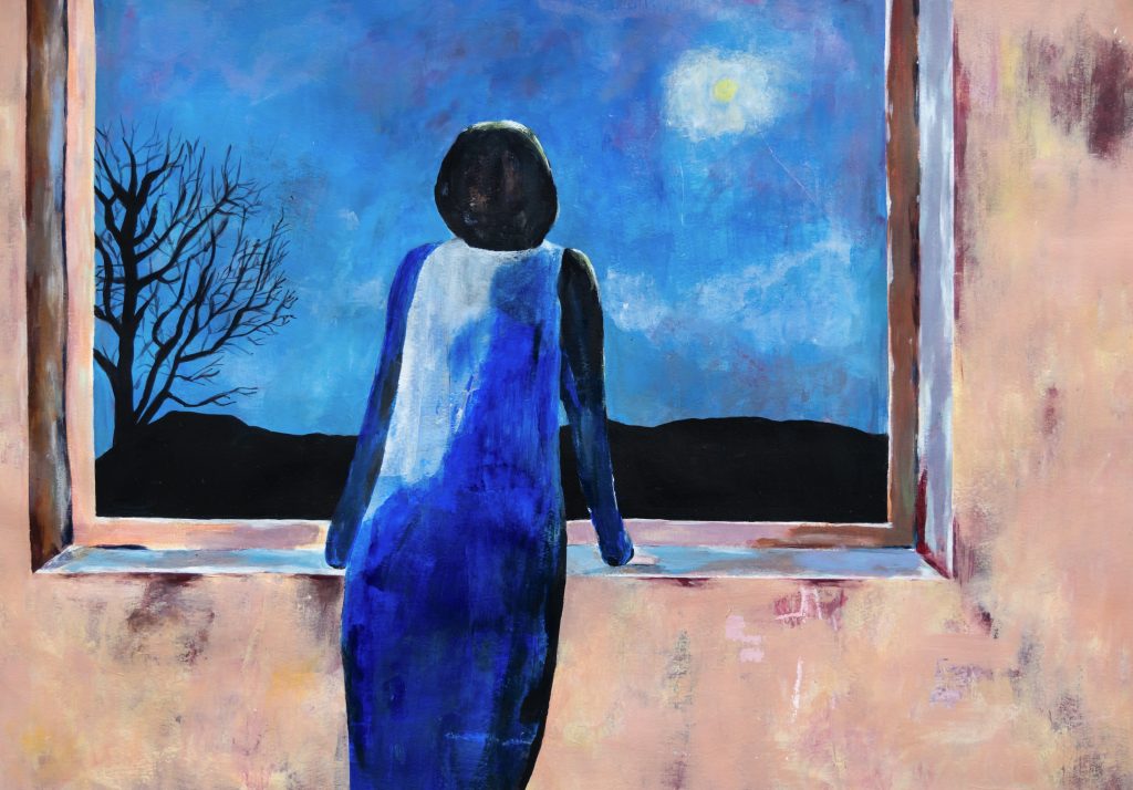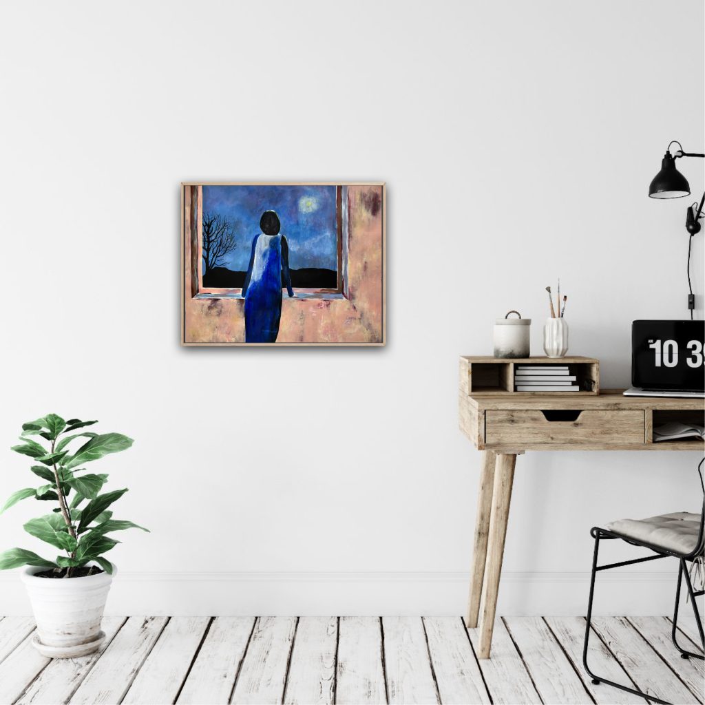 The painting is one of several in a series where I have focused on different rooms and interiors. In an abstract background, I have captured a moment from my imagination.